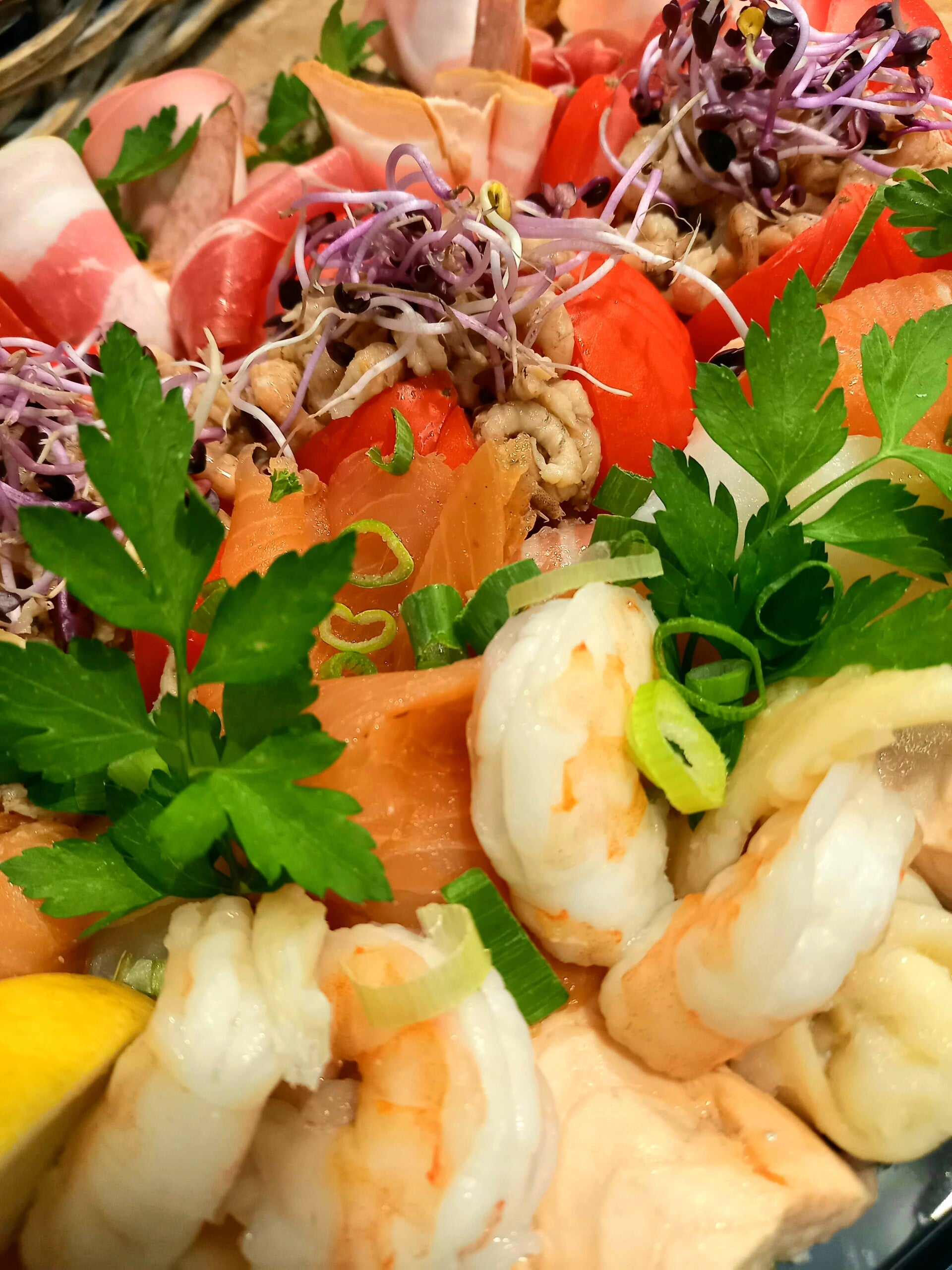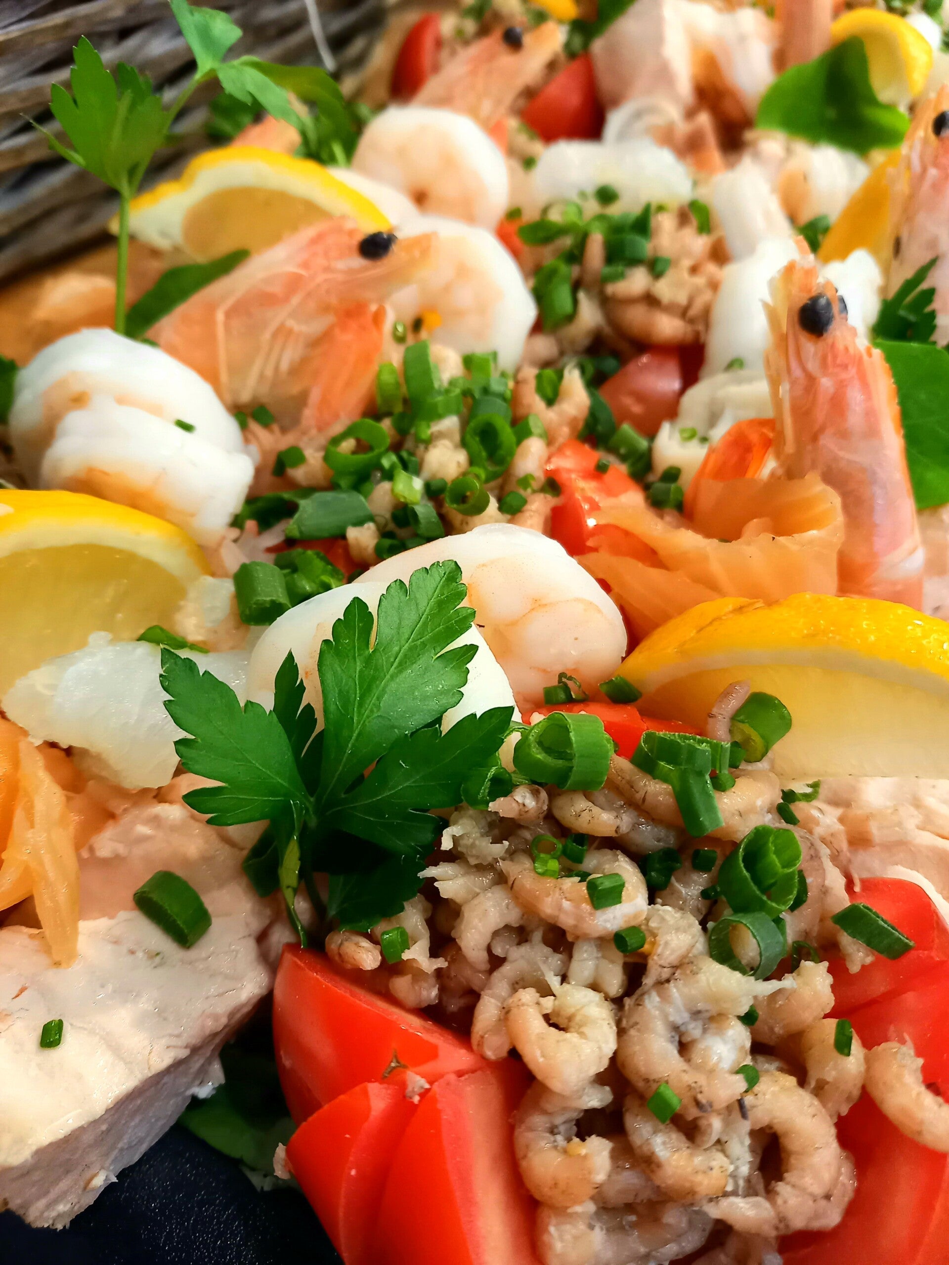 Tomaat gevuld met grijze garnalen of King krabsalade, huisgerookte zalm, diverse soorten gerookte vis, gestoomde zalmfilet en tongrolletjes, schaaldieren zoals scampis en koningsgarnalen ...