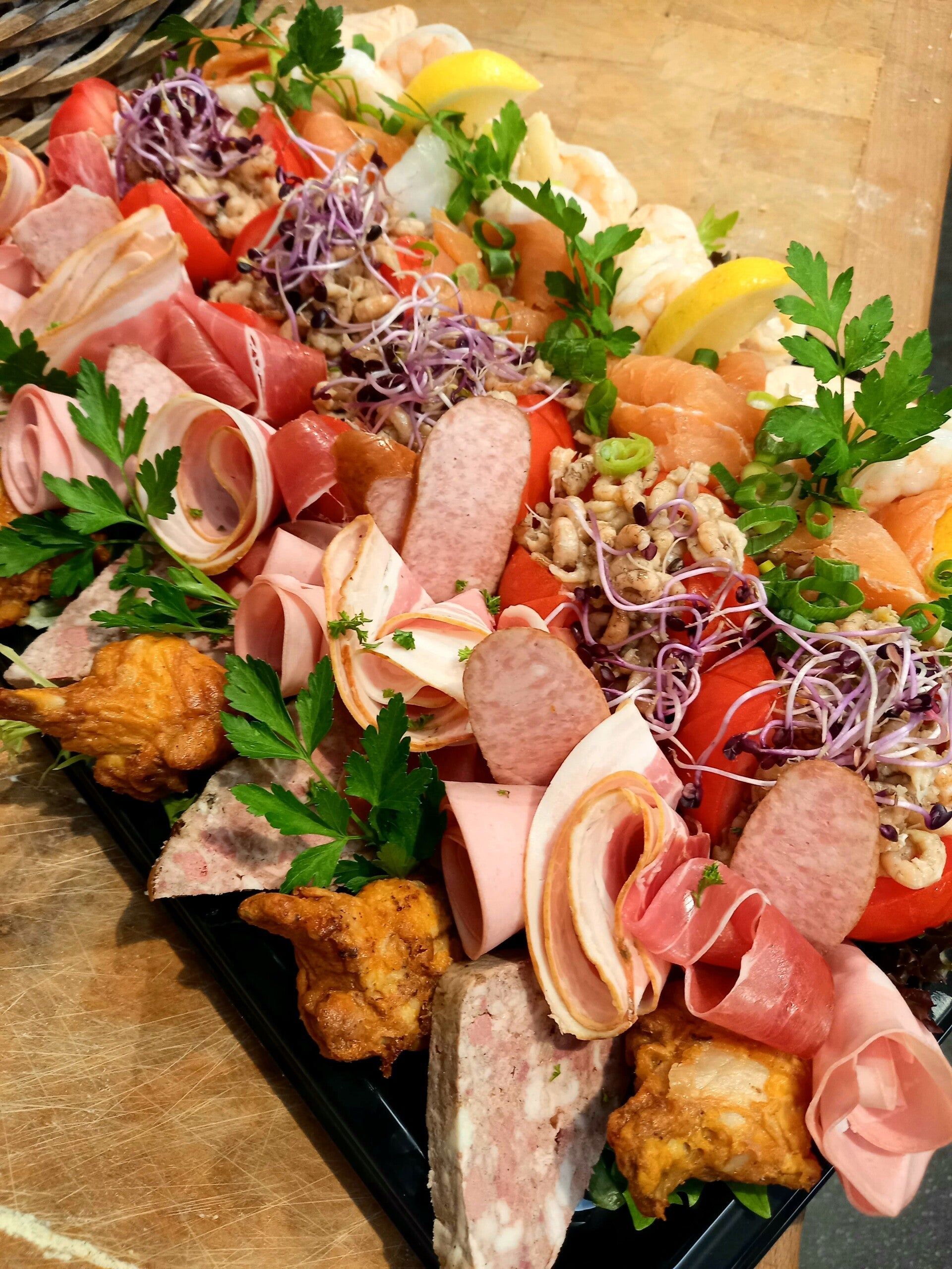 Serranoham met meloen, Pastrami (zacht gepekeld sappig rundsvlees), Mortadella, Porchetta, Seizoenspaté, Franse Cantalkaas