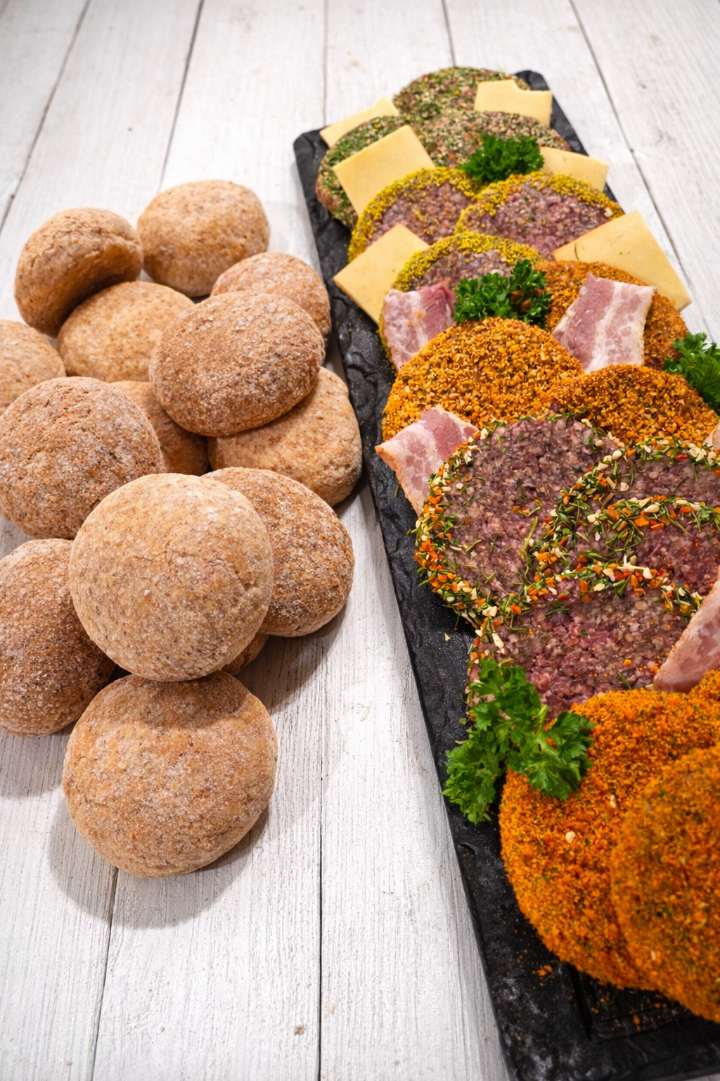 Van het vlees en de broodjes tot alle aangepaste garnituren, groenten, sauzen, dips en toppings.