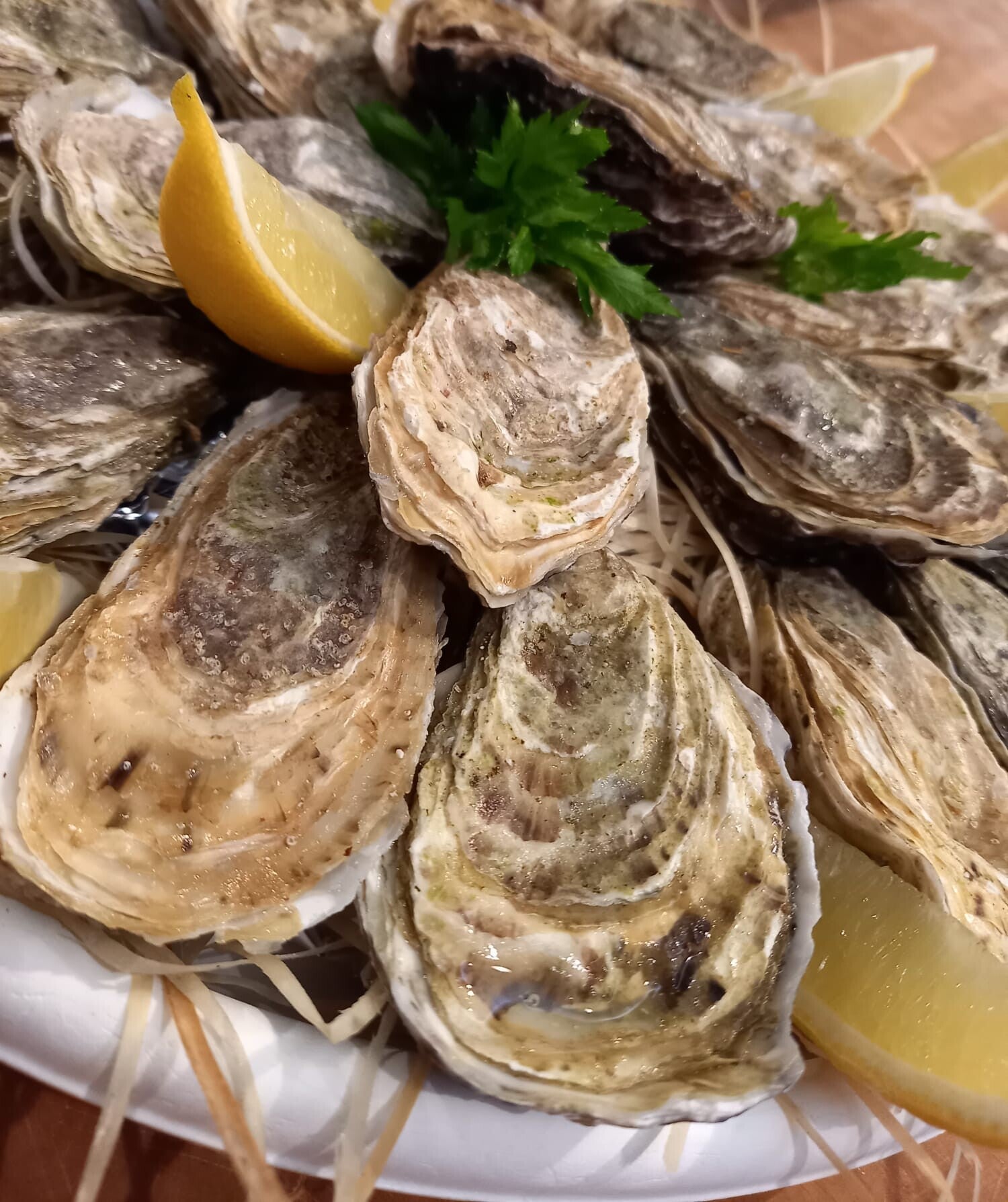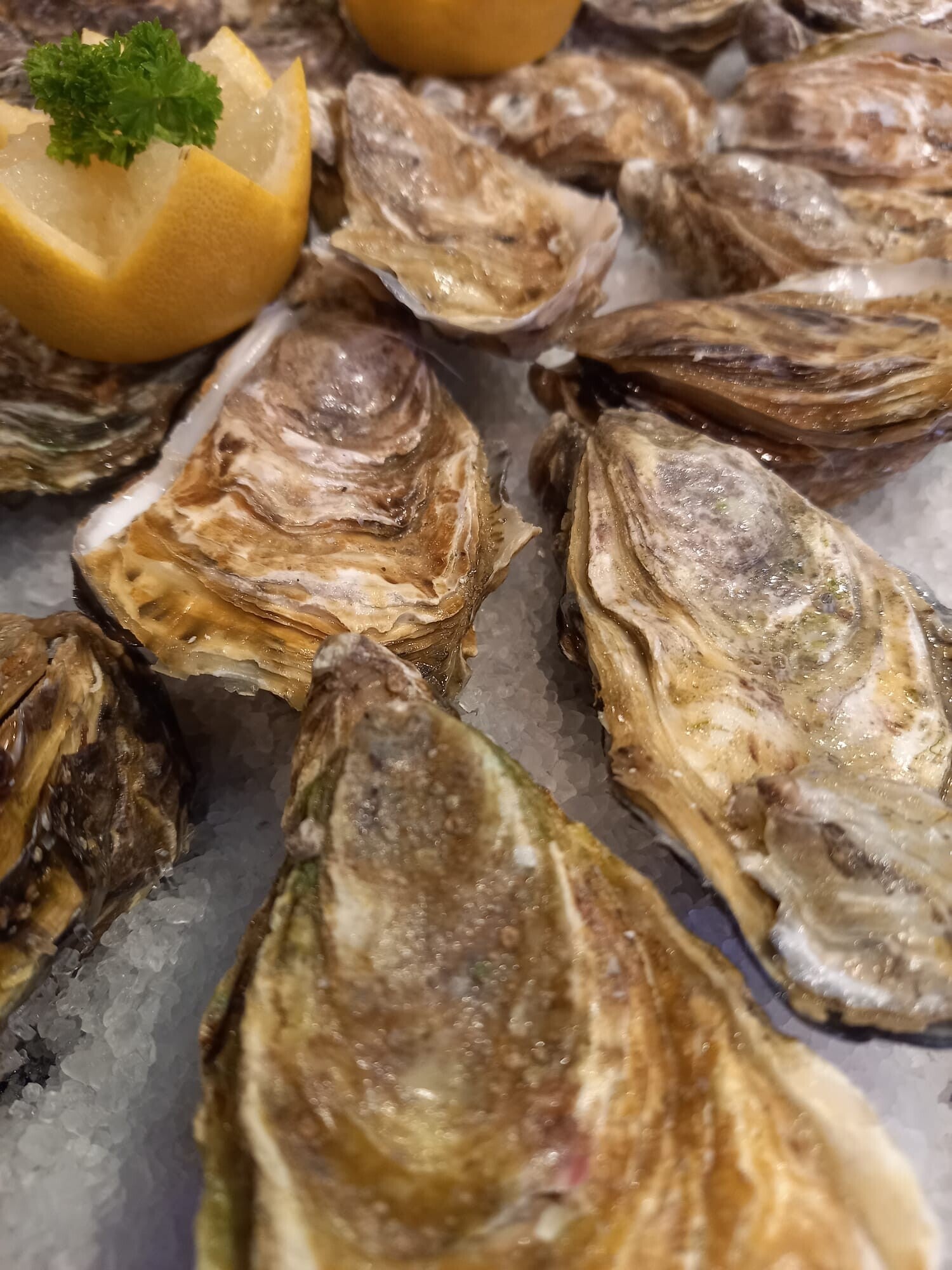 Verse rauwe oesters (open of dicht) op bedje van grof zout met citroenpartjes