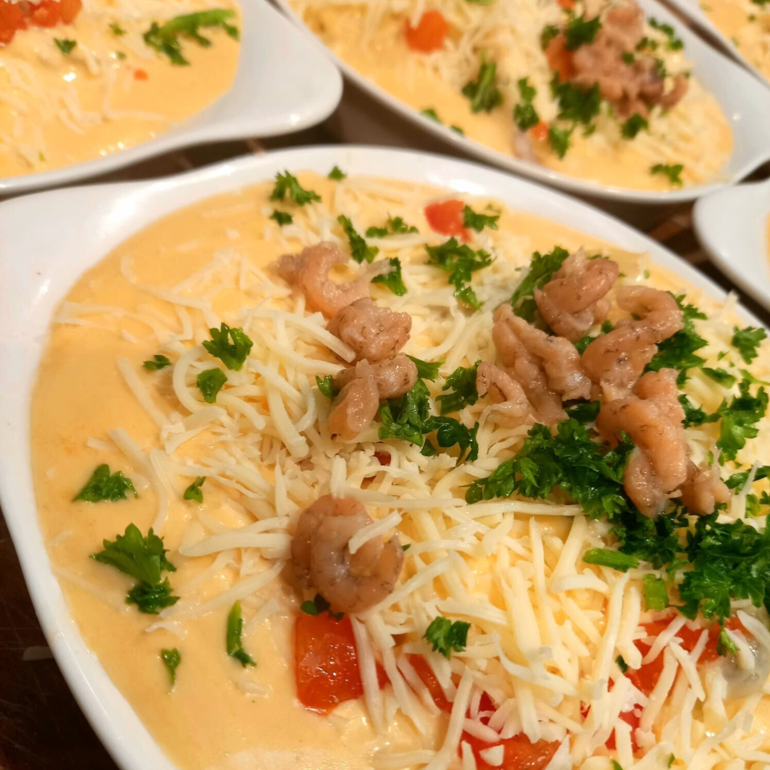 Kabeljauw, zeewolf, zalm, grijze Noordzee garnalen, mosselen, vissaus en kaas om te gratineren