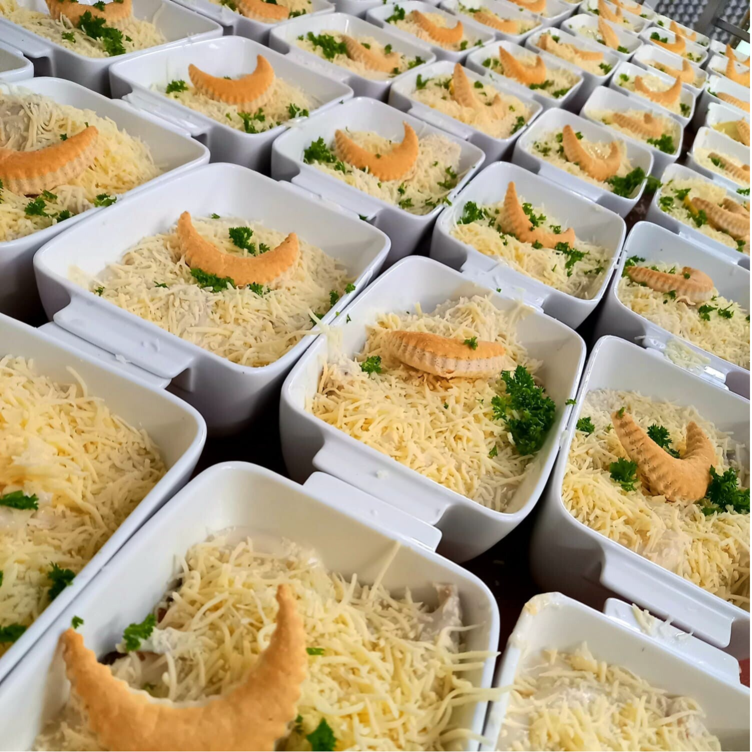 Afgewerkt met kaas om te gratineren en inclusief aardappelpuree apart geserveerd.