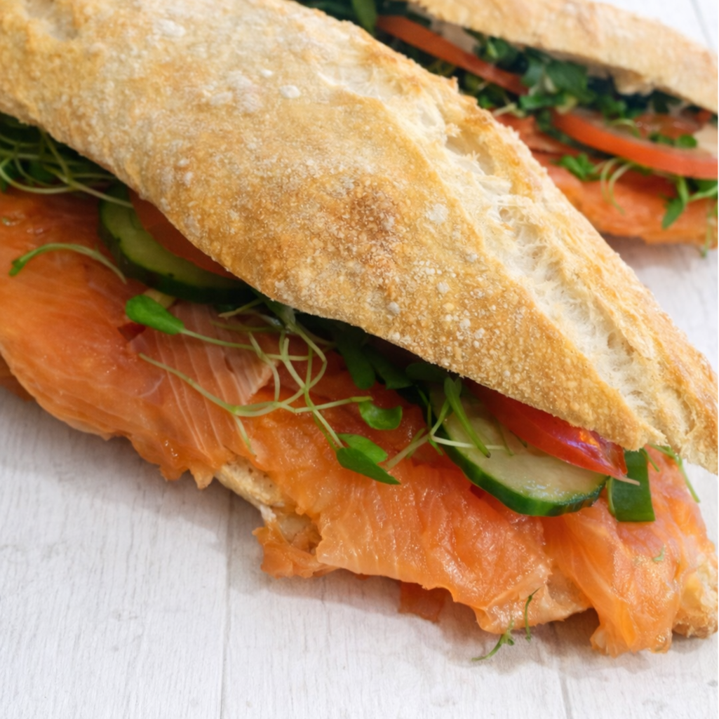 Huisgerookte zalm, zure room, lente-ui, tuinkers, komkommer, tomaat, sla