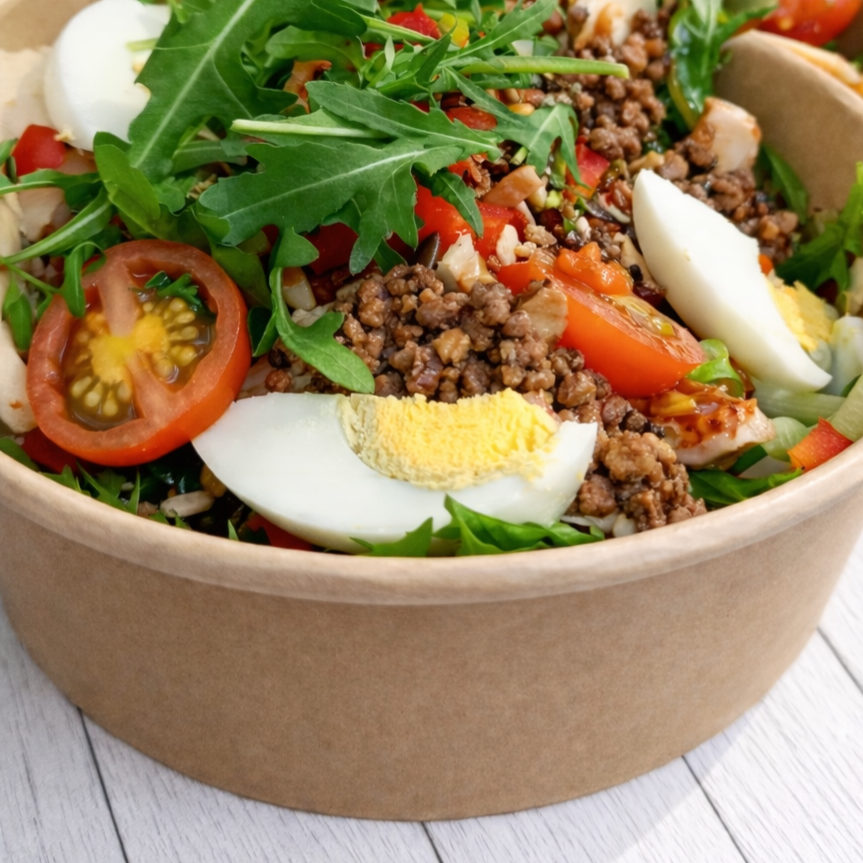 Kruidig gebakken gehakt, bbq-sausje, crispy uitjes, eitjes, tomaat, rucola, lente-ui, paprikablokjes, komkommer, sla