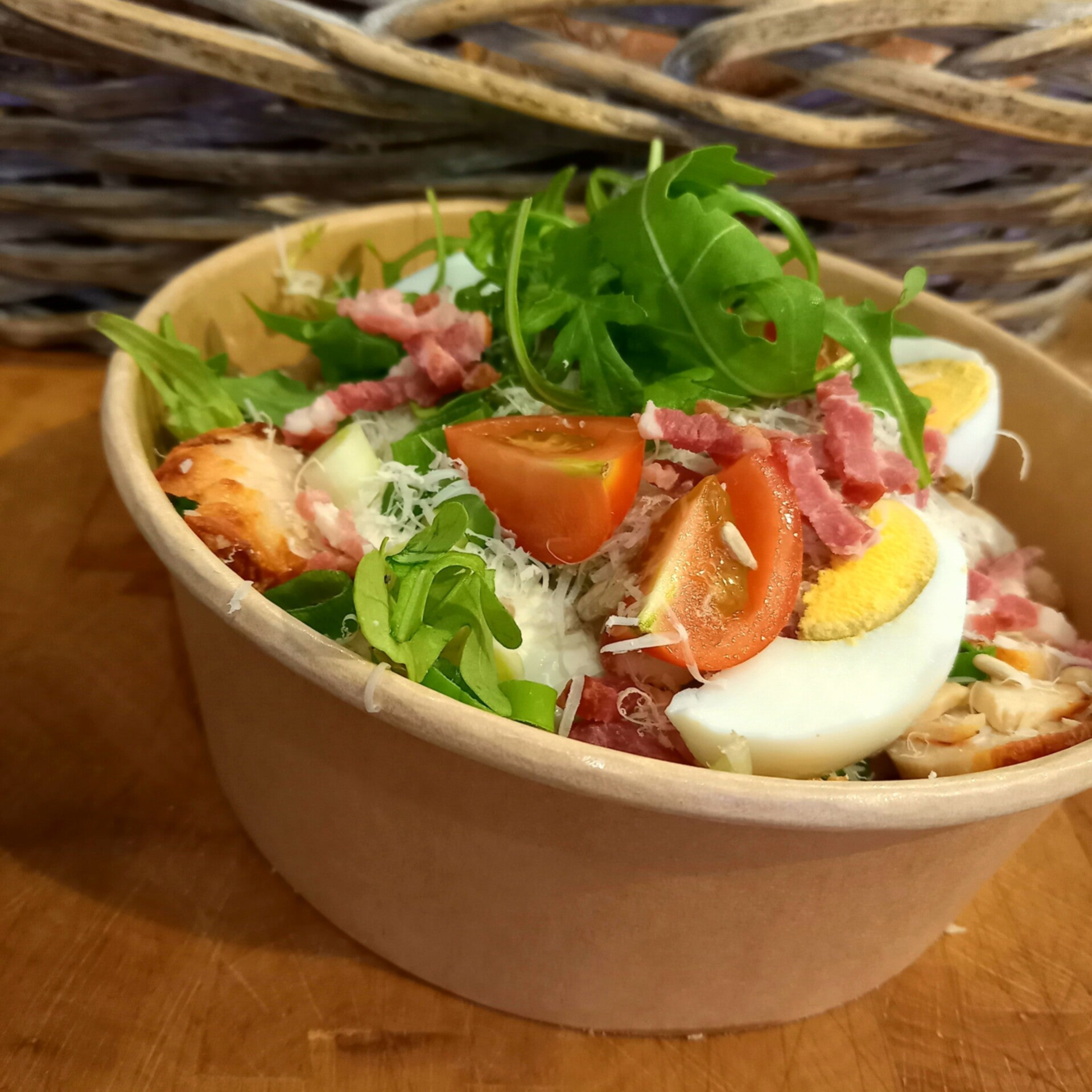 Sappige gebakken kipfilet, spekjes, parmezaanse kaas, eitjes, ceasarsaus, rucola, tomaat, sla, komkommer, paprikablokjes