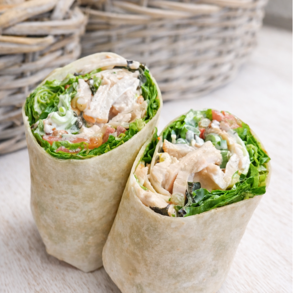 XXL wrap 30cm gevuld met Sappige gebakken kipfilet, truffelmayonaise, crispy ui, sla, tomaat, lente-ui