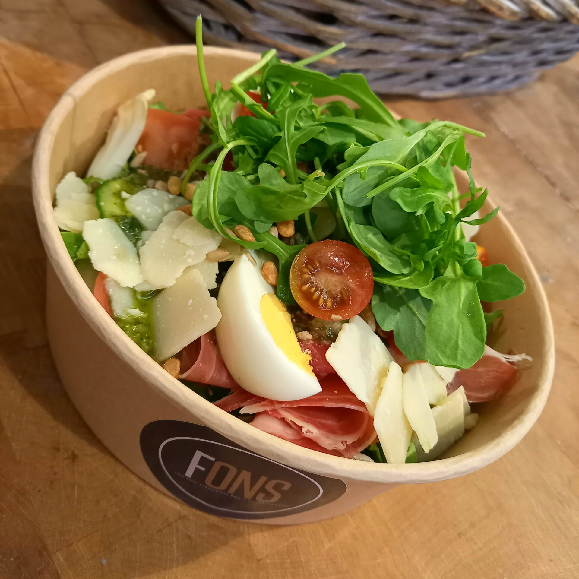 Serranoham, groene pesto, parmezaanse kaas, rucola, lente-ui, ei, tomaat, komkommer, sla...